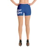 Material has a four-way stretch, so fabric stretches and recovers. 82% polyester, 18% spandex. Blue with white script DBN logo