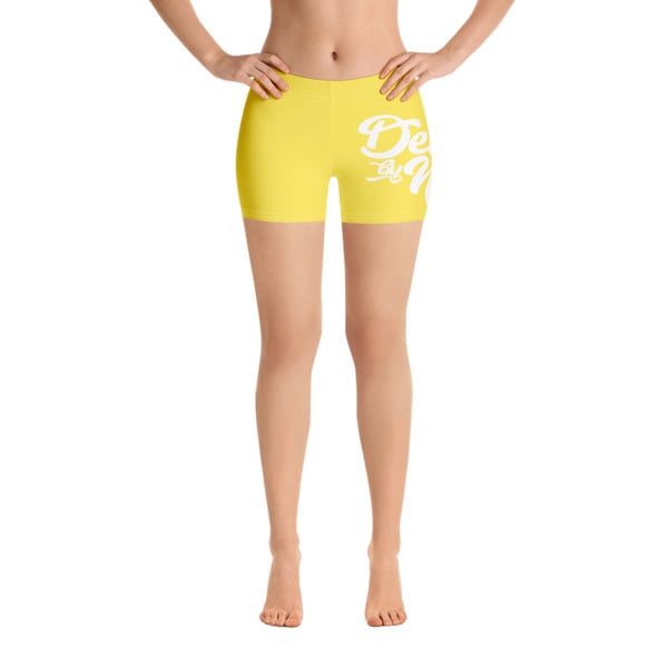 Material has a four-way stretch, so fabric stretches and recovers. 82% polyester, 18% spandex. Yellow with white script DBN logo